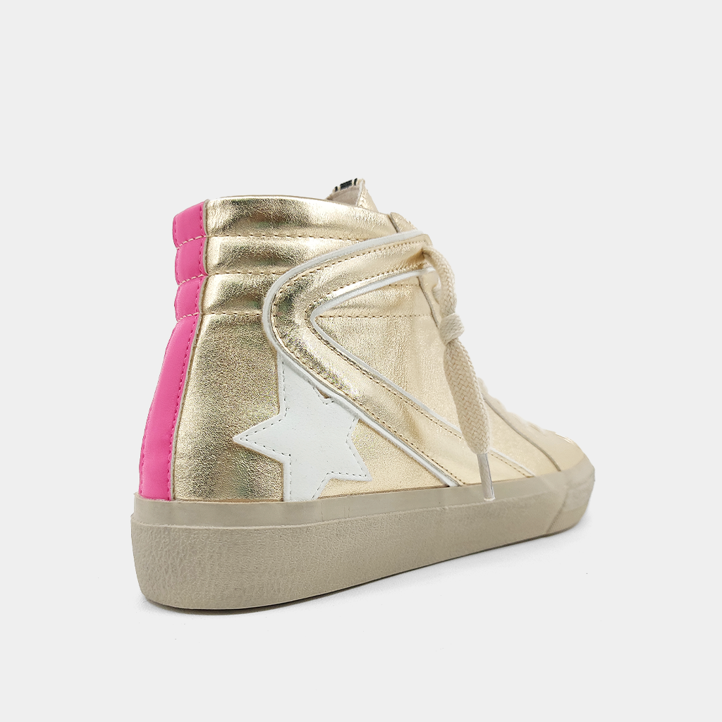 Why we LOVE them: Featuring a vintage high-top style with dazzling gold hue, this sneaker will make you stand out with its hot pink heel accent and white star. This style is always a sell out for us so do not wait to snag your size! (also comes with extra black/white laces)